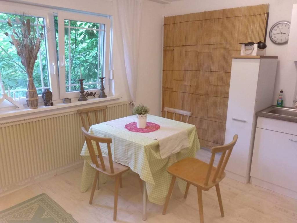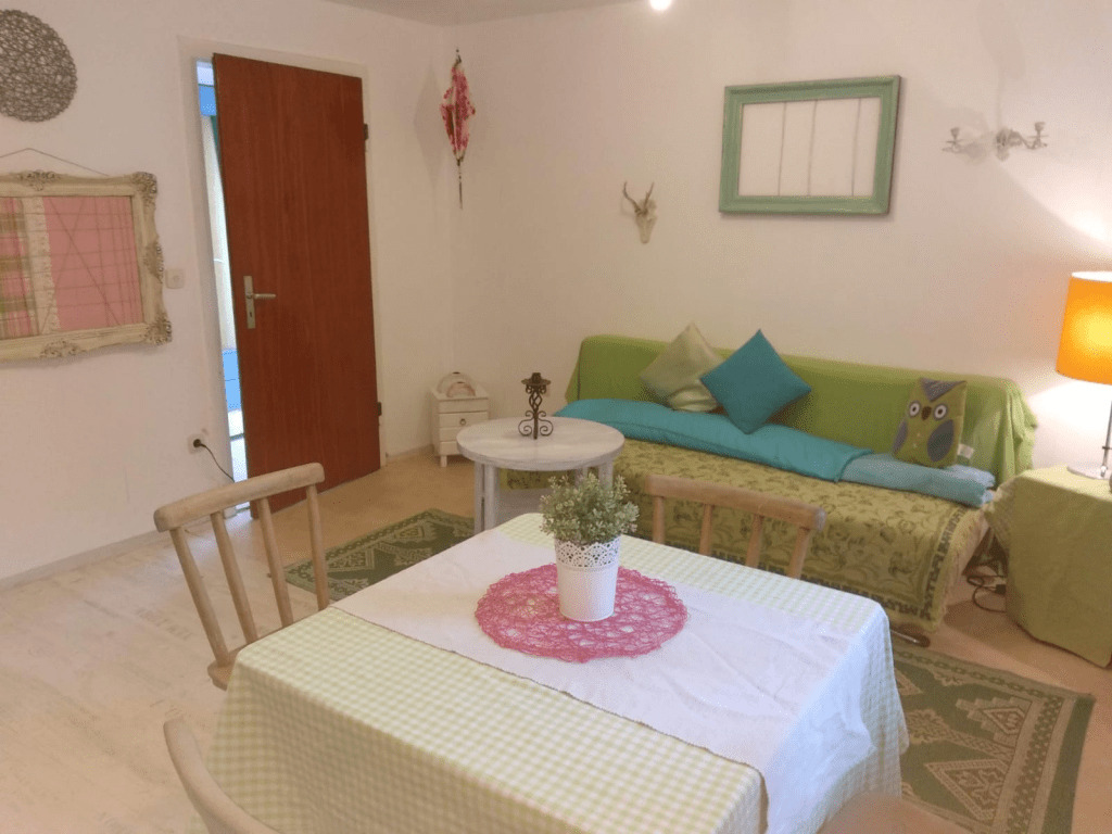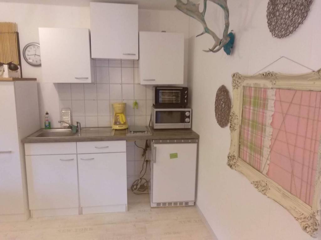 Unsere kleine individuell eingerichtete Ferienwohnung, hat eine Größe von ca. 40m2. Diese besteht aus zwei Zimmern. Ein Wohnzimmer mit einem Schlafsofa und kleiner integrierter Küche, einem Doppelbettschlafzimmer (Maße Bett 1,80×2,00 m) und einem Bad mit Dusche. Hier ist Platz für eine Familie mit zwei Kindern. Ein Babybeistellbett kann gerne extra gestellt werden. Oder für 3 Erwachsene Personen. Tiere sind nach Absprache kein Problem.